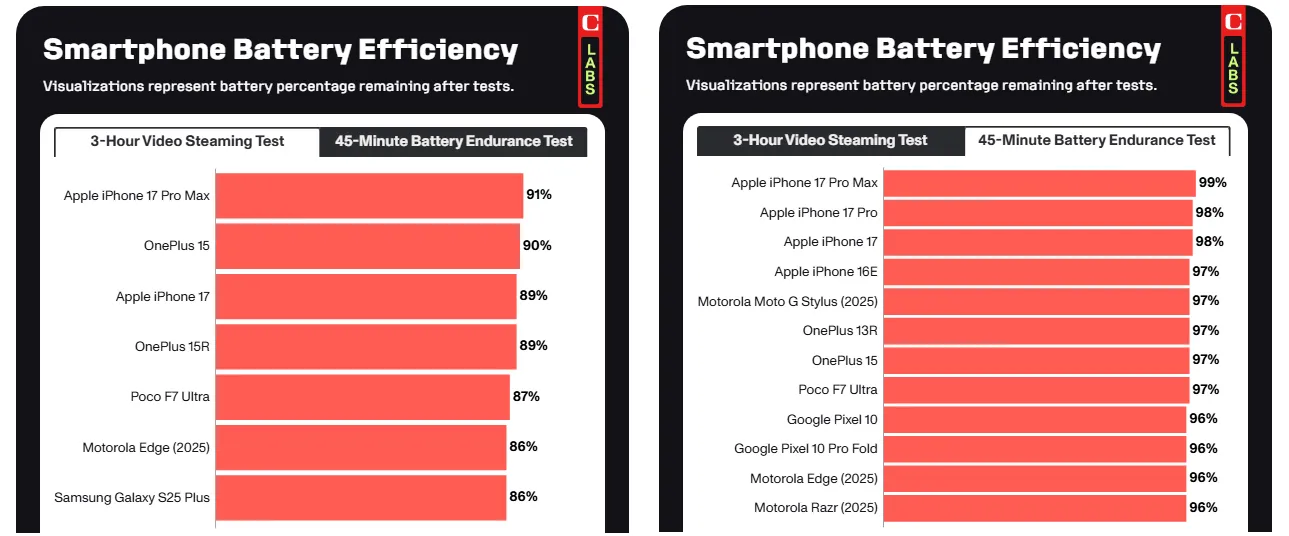 Авторитетное издание CNET протестировало 35 актуальных смартфонов и пришло к выводу, что iPhone 17 Pro Max стал самым живучим устройством по времени работы от батареи. В сценариях с воспроизведением видео и активным использованием приложений флагман Apple опередил всех конкурентов благодаря энергоэффективному чипу A19 Pro и глубокой оптимизации iOS — даже несмотря на то, что его аккумулятор не является самым ёмким на рынке.